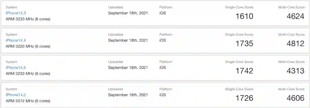 iPhone 13系列的Geekbench得分