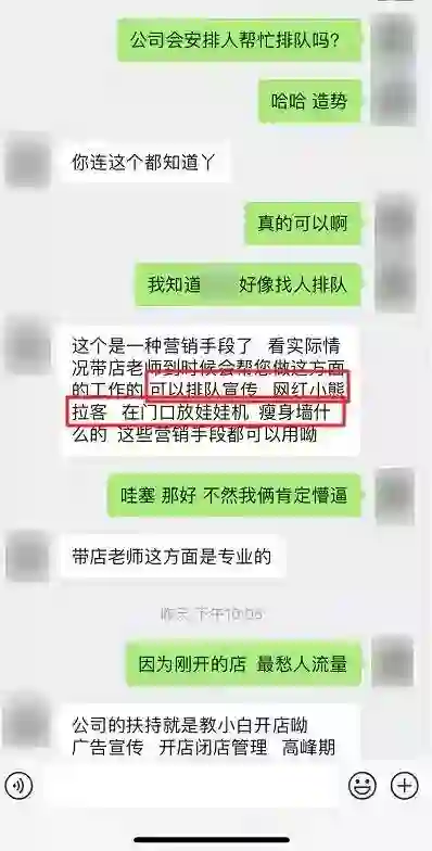 在我提到开店之后是否会有人帮忙造势,比如排队什么的,他就立马把这个行业的秘密抖了出来。