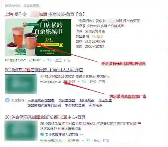 ①百度搜索奶茶加盟的时候,出现“广告”标识的都不要相信;