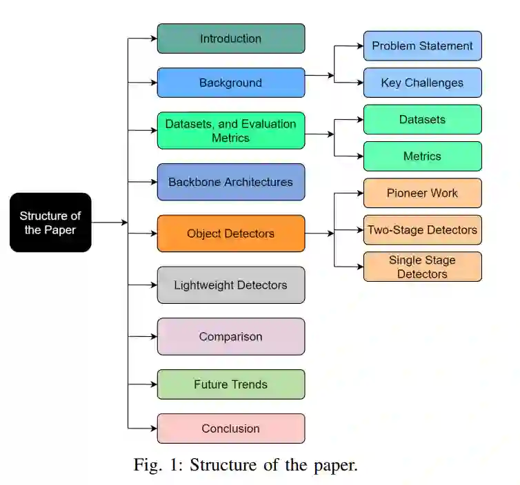 目标检测是对图像或视频中的物体进行分类和定位的任务。近年来,由于其广泛的应用而倍受关注。本文概述了基于深度学习的目标检测器的最新发展。还提供了用于检测的基准数据集和评估指标的简要概述,以及用于识别任务的一些著名的主干架构。它还涵盖了边缘设备上使用的当代轻量级分类模型。最后,我们在多个指标上比较了这些体系结构的性能。