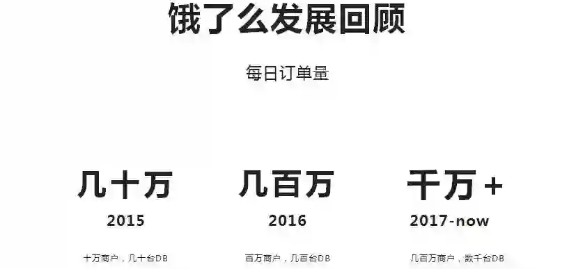 饿了么发展最快阶段也是最近四五年的事情,我是2015年进入饿了么的,那时每天才几十万的订单,服务器也不多;到了2016年时每天订单达到了几百万,商户也更多了;而2017年不管是订单、运单都是千万以上,直到现在都还在快速增长。