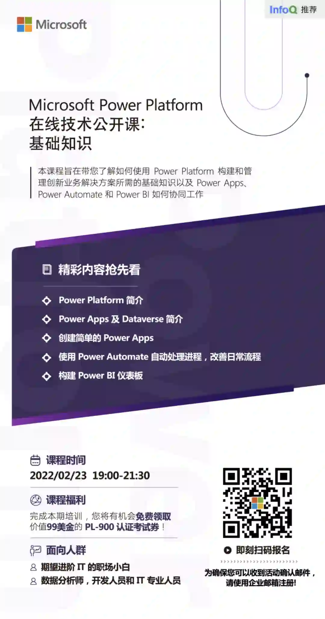 2022 年 2 月 23 日 19:00-21:30,锁定《Microsoft Power Platform 在线技术公开课: 基础知识》,你将通过 150 分钟的公开课,获得创建创新解决方案所需的技能和培训。立即点击【阅读原文】或扫描图中二维码进行报名。