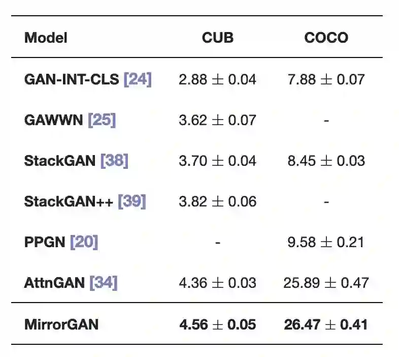 在目前较为主流的数据集COCO数据集和CUB鸟类数据集上,MirrorGAN都取得了最好成绩。