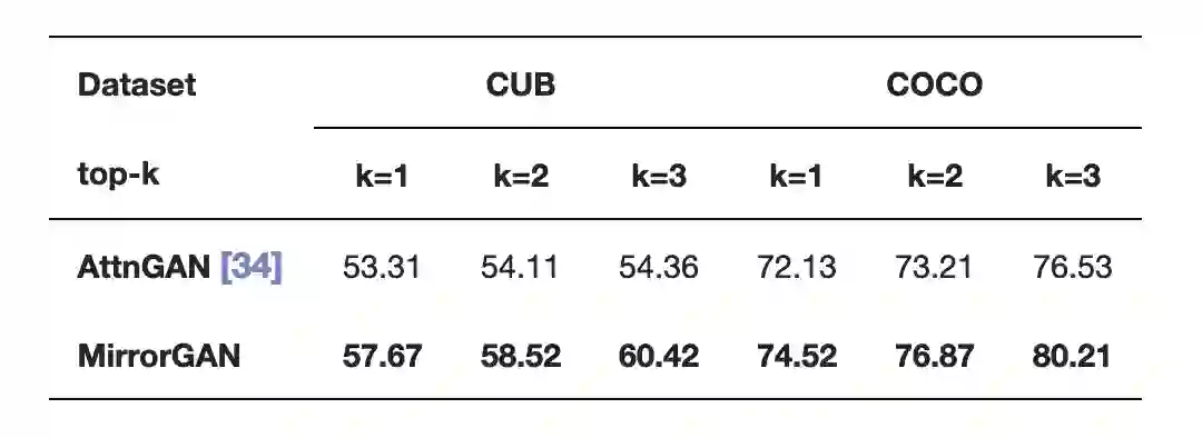 表2展示了AttnGAN和MirrorGAN在CUB和COCO数据集上的R精度得分。
