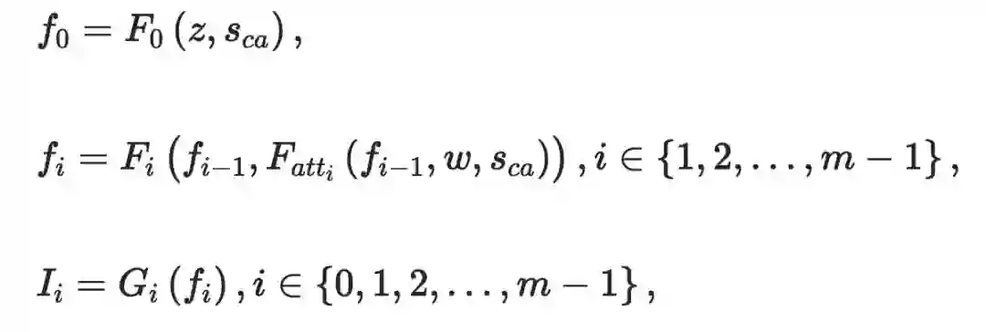 使用{F0,F1,…,Fm-1}来表示m个视觉特征变换器,并使用{G0,G1,…,Gm-1}来表示m个图像生成器。 每个阶段中的视觉特征Fi和生成的图像Ii可以表示为: