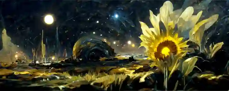 图源:Disco Diffusion程序截图 整个画作的描述词可拆解为五个维度理解——画种描述、内容描述、画家描述、参考渲染方式、颜色描述。画种描述:A beautiful painting of;内容描述:a singular lighthouse, shining its light across a tumultuous sea of blood;画家描述:by greg rutkowski and thomas kinkade;参考渲染方式:Trending on artstation(全球最专业的CG艺术家社区,又称A站);颜色描述:yellow color scheme。 通过对AI画作五个维度描述词的撰写,上文提到的博主依靠下面的描述词得到了系列让人惊叹的画作:“A beautiful painting of a starry night, shining its light across a sunflower sea by James Gurney, Trending on artstation.” "yellow color scheme"(黑色字体标出了与默认描述词的差异)