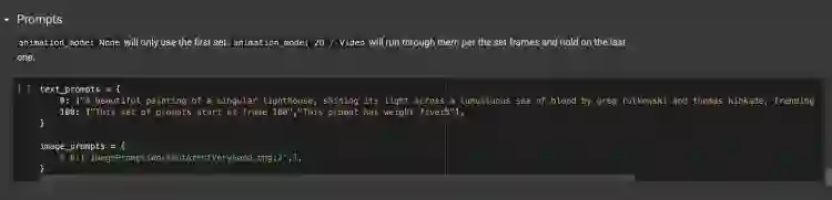 图源:Disco Diffusion程序截图 第三部是最关键的,即对所想生成的画作进行描述。打开程序“Prompts”(描述词)部分,初始页面内给出的默认描述词为“A beautiful painting of a singular lighthouse, shining its light across a tumultuous sea of blood by greg rutkowski and thomas kinkade, Trending on artstation.", "yellow color scheme"