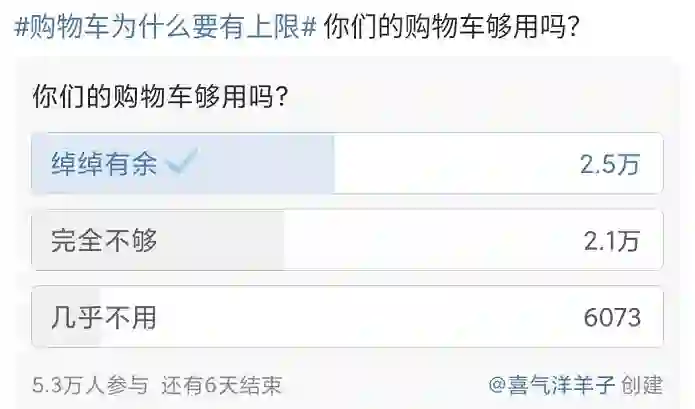 其中有人发起一个投票,你的购物车够用吗,有5.3万人参与投票,其中绰绰有余的2.5万人,而表示购物车完全不够的也有2.1万人,说明这个痛点还是有较大一部分用户群体存在痛点的。