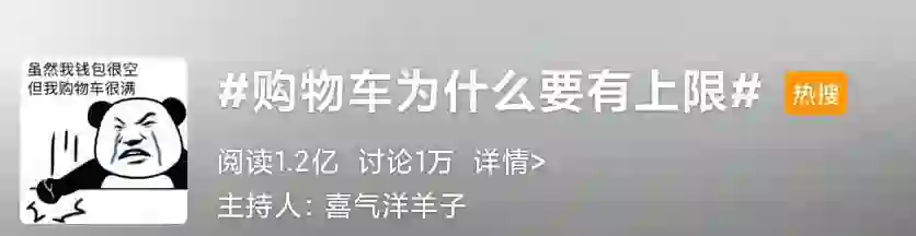 在剁手的同时,一个微博热搜话题引起我的兴趣「#购物车为什么要有上限」,发现该话题在微博的阅读量超过1.2亿,讨论超过1万,许多剁手党纷纷表示购物车完全不够用,阻止了广大尾款人剁手的脚步。
