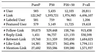 本文将作者收集并整理的推特数据集和代码一起公开了出来,统计信息如图2所示,希望能够对后续的研究者们起到一定帮助作用。本文数据集的一些棘手的特征,譬如特征的缺失和标签的极端稀疏,正是普遍存在于绝大多数真实社交网络数据上的客观挑战。