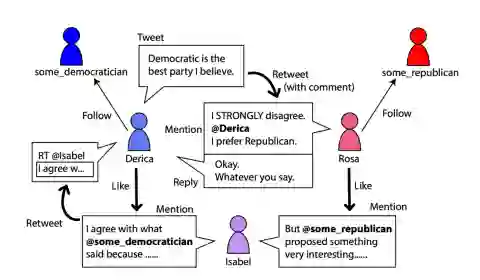 Twitter上不同关系类型的一个例子,其中德里凯森是自由派(左),罗莎是保守派(右),伊莎贝尔没有明显的派别倾向。