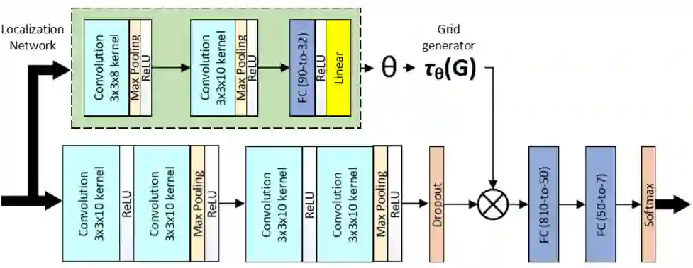 空间转换器由两个卷积层(每个卷积层后面是 max pooling 和 ReLU)和两个全连接层组成。在回归变换参数后,将输入转换为采样网格的生成数据。空间变换器模块主要通过估计被关注区域上的一个样本来聚焦图像中最相关的部分。