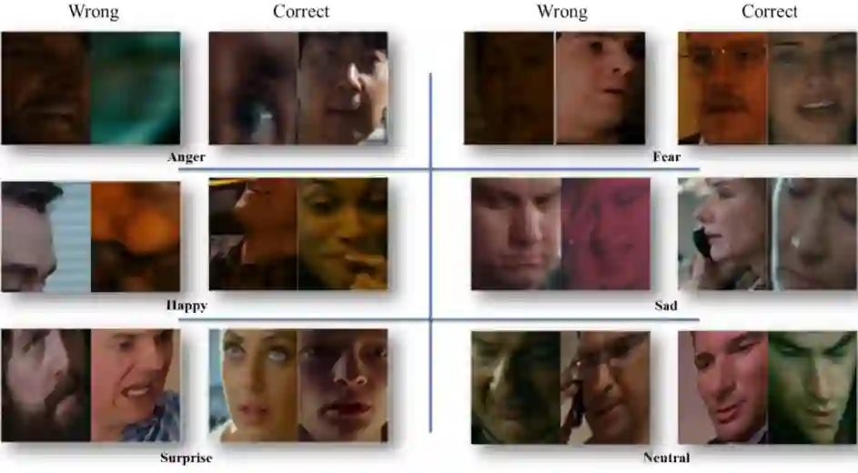 下图提供了一个正确和错误的分类结果图示,所有剩余的六个类别如下图所示。这些结果表明,至少在某些情况下,性能差的原因可能是面部对齐步骤的失败,而不是模型识别的问题。