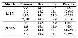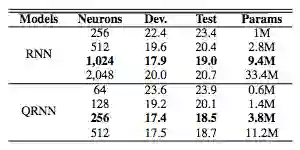 表 1:QRNN 和 RNN 模型在 TIMIT 数据集的开发集和测试集上的音素误差率(PER%)。「Params」代表可训练参数的总数量。