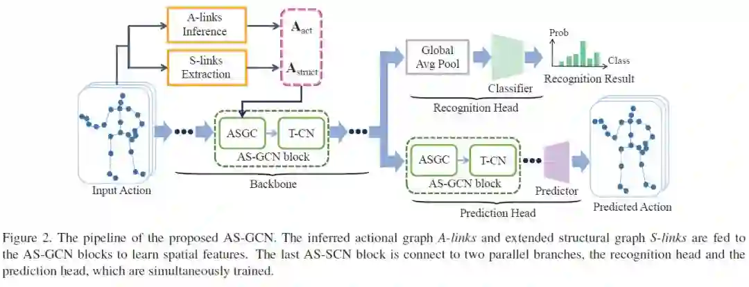 摘要:利用skeleton数据进行动作识别是近年来计算机视觉领域的研究热点。以往的研究大多基于固定的skeleton图,只捕捉关节之间的局部物理依赖关系,可能忽略了关节间的隐式关联。为了捕获更丰富的依赖关系,我们引入了一种称为A-link推理模块的编解码器结构,以直接从动作捕获特定于动作的潜在依赖关系,即动作链接。我们还扩展了现有的skeleton图来表示更高阶的依赖关系,即结构链接。将这两种类型的链接结合成一个广义的skeleton图,进一步提出了Actional-Structural Graph Convolutional Networks (AS-GCN),它将动作结构图卷积和时间卷积作为基本的构建块,学习动作识别的时空特征。在recognition head的基础上,增加了一个future pose prediction head,通过自监督来帮助捕获更详细的动作模式。我们使用两个skeleton数据集,NTURGB+D和Kinetics来验证AS-GCN在动作识别中的有效性。与最先进的方法相比,提出的AS-GCN实现了持续的较大改进。AS-GCN作为一种副产品,在未来的姿势预测中也显示出良好的应用前景。