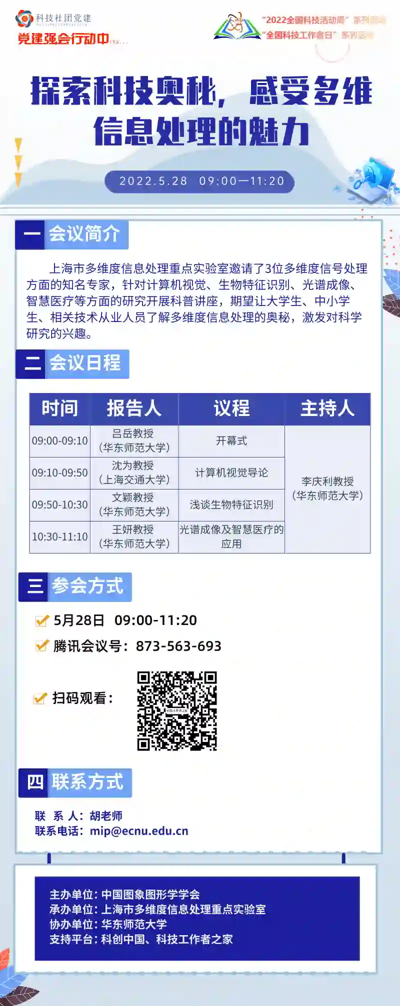 上海市多维度信息处理重点实验室邀请了3位多维度信号处理方面的知名专家,针对计算机视觉、生物特征识别、光谱成像、智慧医疗等方面的研究开展科普讲座,期望让大学生、中小学生、相关技术从业人员了解多维度信息处理的奥秘,激发对科学研究的兴趣。