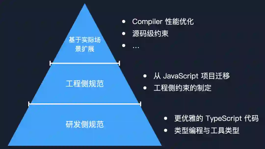 以我们已经落地的规范为例,一定是研发侧规范作为最基础的一层,让所有开发者首先懂得什么样的 TypeScript 代码是好的以及怎么写出好的 TypeScript 代码,然后工程侧规范才能发挥作用,将团队成员的代码进行统一的约束,进一步的提高整体编码规范。