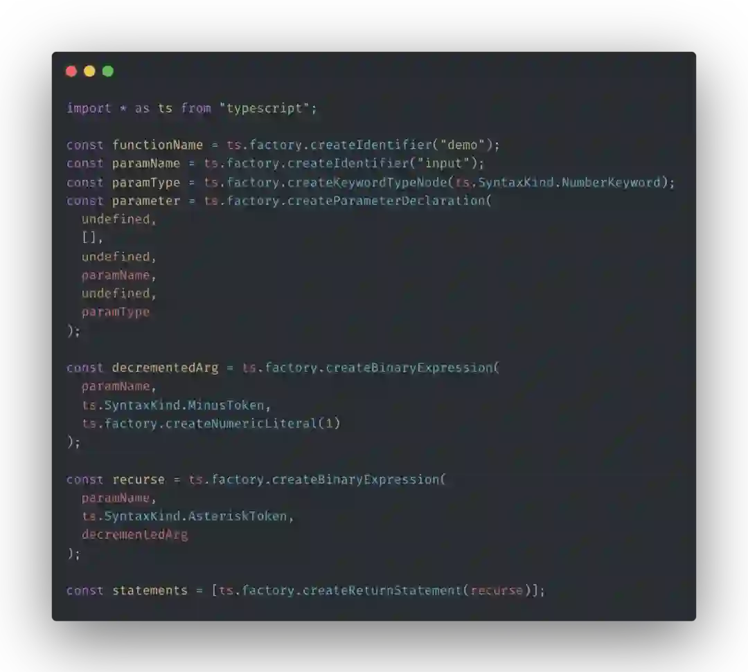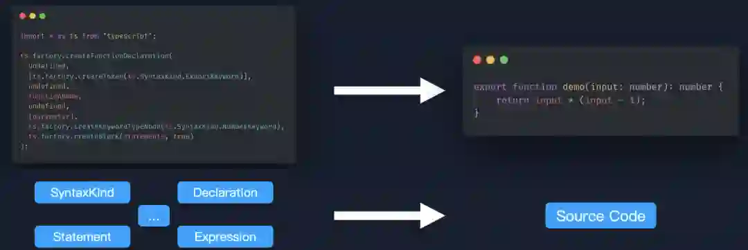 而要做源码级约束,由于我们需要关注类型,很显然最好的方式是使用 TypeScript 自己的 Compiler API 来做,你可以简单的理解为类似 Babel 系列的包。但 Compiler API 存在着一定的使用成本,它需要你有一定的编译原理知识储备,比如看上面的这张图,创建 Identifier、TypeNode、Declaration、Expression、Statement 等等,我们看一下这一段代码最后生成了什么样的 TypeScript 代码: