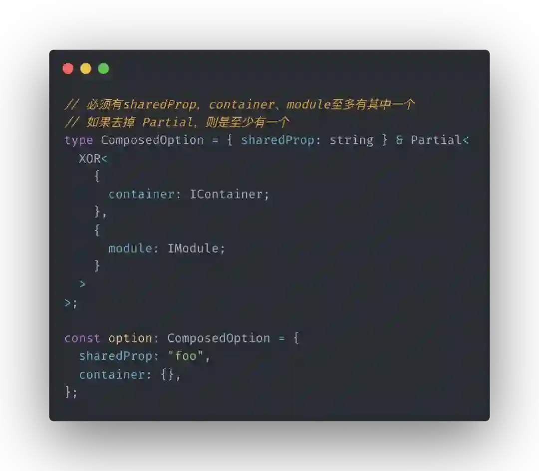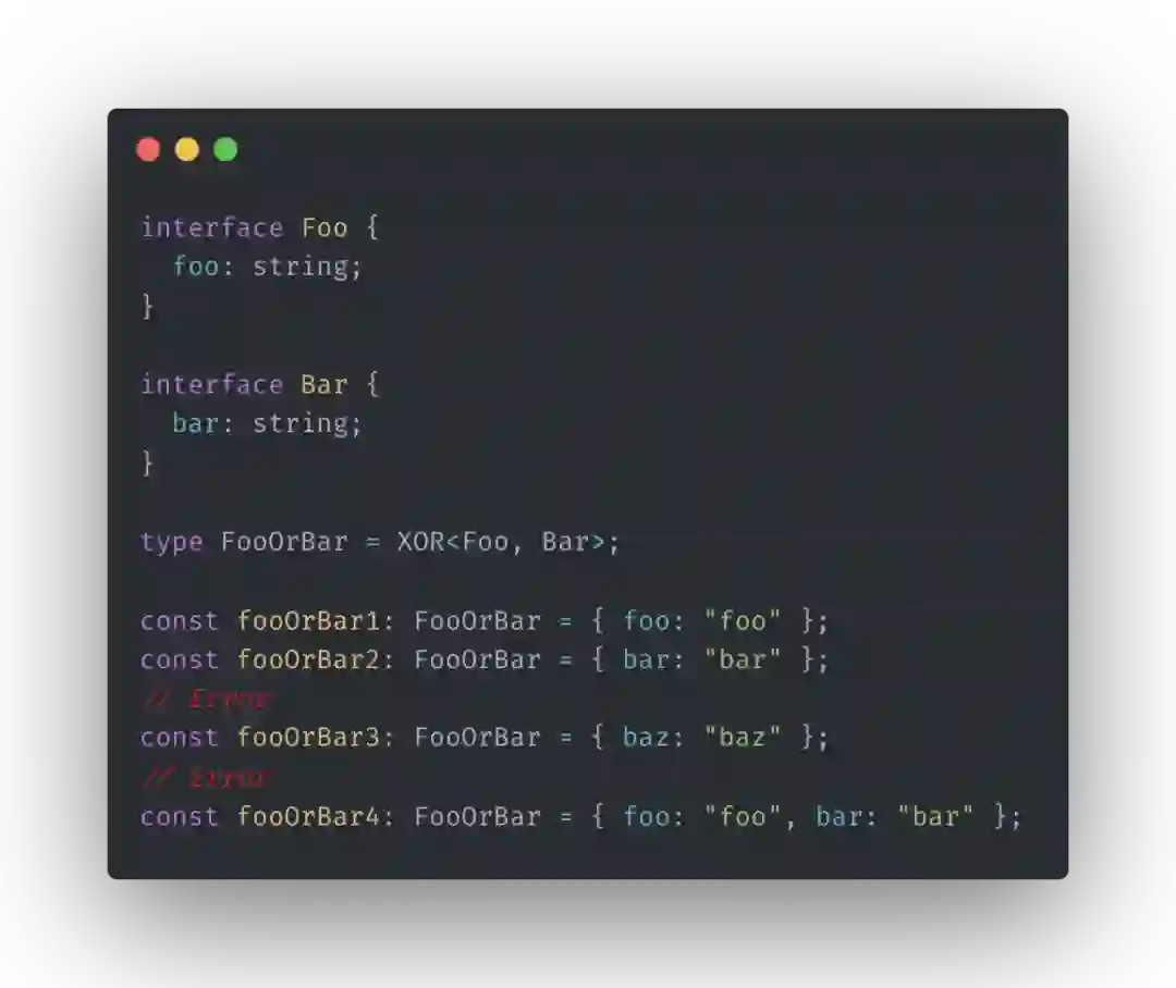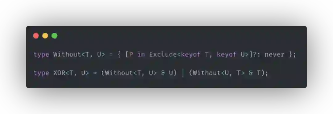 我们来看一个实际场景,互斥工具类型,常见的场景比如有某个对象只能,且必须满足多个接口之一,如登录用户和访客的信息,还有场景如某个对象中的多个属性存在依赖关系,要么同时存在,要么同时不存在。我这里直接给出具体的实现,其实最核心就是通过显式指定部分属性为 never 类型,来阻止我们不想要的类型存在。