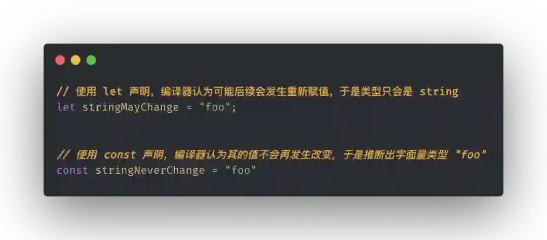 我们可以直接从字面量的层面提供类型,比如状态码、状态标识这一类完全可以通过 TypeScript 提供的字面量类型来收窄到更精确的范围。TypeScript 本身的控制流分析其实也是做了相关优化的,比如使用 const 声明的原始类型变量,由于不会再被更新,你会发现它直接被推断为最精确的字面量类型,而 let 则只会推断到基本类型。