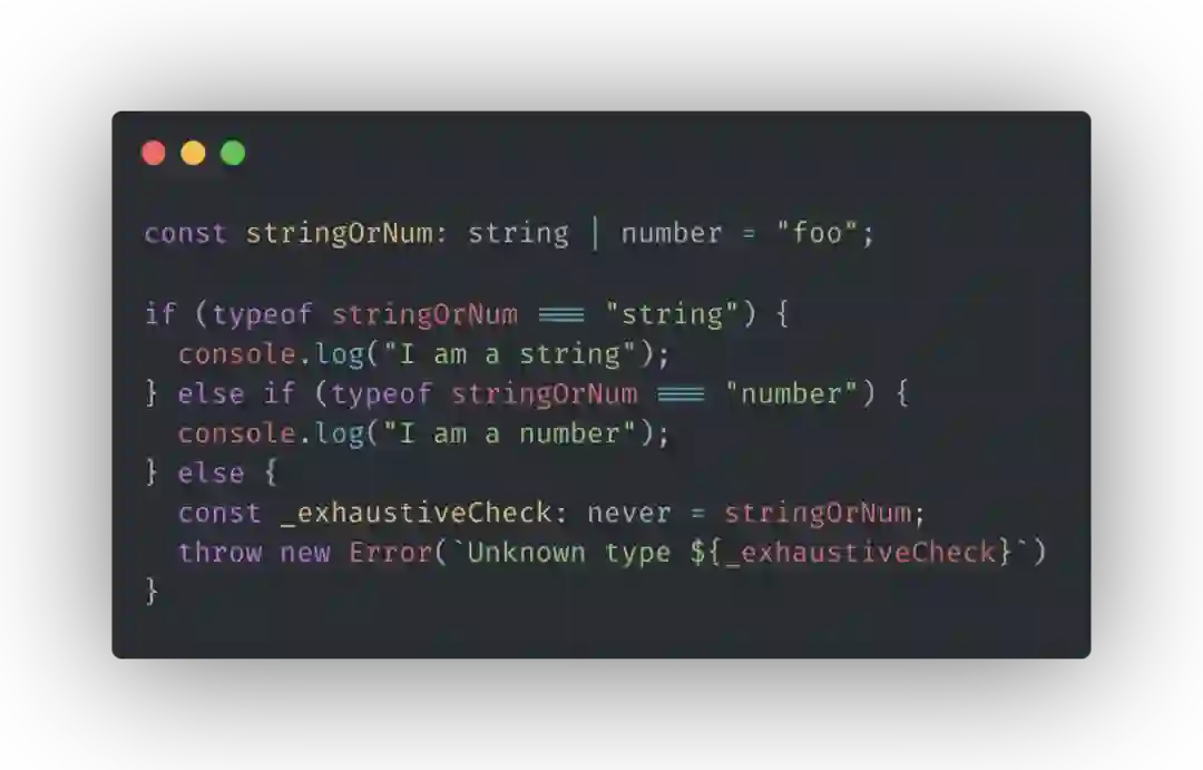 在这里的例子中,由于 TypeScript 的类型控制流分析,在走到最后一个 else 块的时候,由于这个变量的类型分支已经被处理完毕,只剩下了 never,所以这里不会抛出错误。如果新增了一个联合类型成员比如 boolean,那么这里就会同时抛出编译时错误和运行时错误。