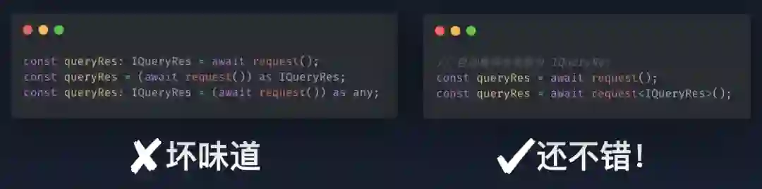 想要写好 TypeScript 类型就离不开泛型,一般来说在实际项目中我们可能会有两种使用方式,显式与隐式。先来看一个常见场景,在为请求结果声明类型时我们可能会这么做,左边的一二两种是,请求方法完全没有类型的情况,这个时候使用类型断言或显式类型标注就行,第三种则是请求方法带了类型,但经过数任维护者改动后类型已经越来越偏了,你又懒得修正实际类型,就会变成这种 as any 再 as 到实际请求类型的情况。