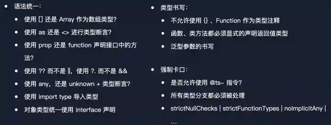 还有使用新的语法代替掉老的语法,比如空值合并代替逻辑或,可选链代替逻辑与。对象类型只能用 interface 声明,类型别名应该用来做联合类型、函数类型、工具类型的声明等。接着是专注 TypeScript 类型书写的部分,比如不允许使用空对象或顶级对象 Function Object 来作为类型注释,函数需要显式的声明返回值,这是为了清晰地判断一个函数是否有副作用,以及泛型参数,是否要求写泛型参数的约束与默认值,比如 T extends any = xxx 这样。最后则是强制的卡口,如我们在 never 类型中提到的,对于 switch case 语句的所有类型分支都要被处理,以及一些对于约束代码质量很有帮助的 tsconfig 配置,如 strict 系列的 strictNullChecks 这种。