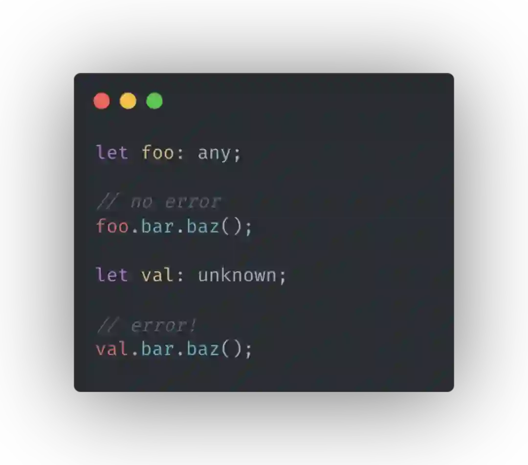 所以 TypeScript 后续又引入了 unknown,它们的最大区别是 unknown 仍然是有类型检查的,unknown 的变量在后续操作中需要手动断言,也就意味着你虽然不知道它应该是什么类型,但在这里它就是这个类型。所以 unknown 就像是类型安全版本的 any。