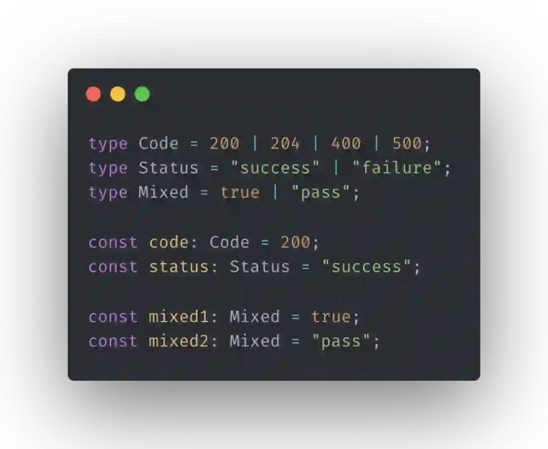 在某些情况下,如果我们只是使用 TypeScript 内置的类型,比如 number、string 这种,去注释可能取值固定的属性,如请求状态码的值是固定的如 200、401 等,看起来是没有问题,但其实还可以做得更好、更精确,比如我们直接使用字面量类型。