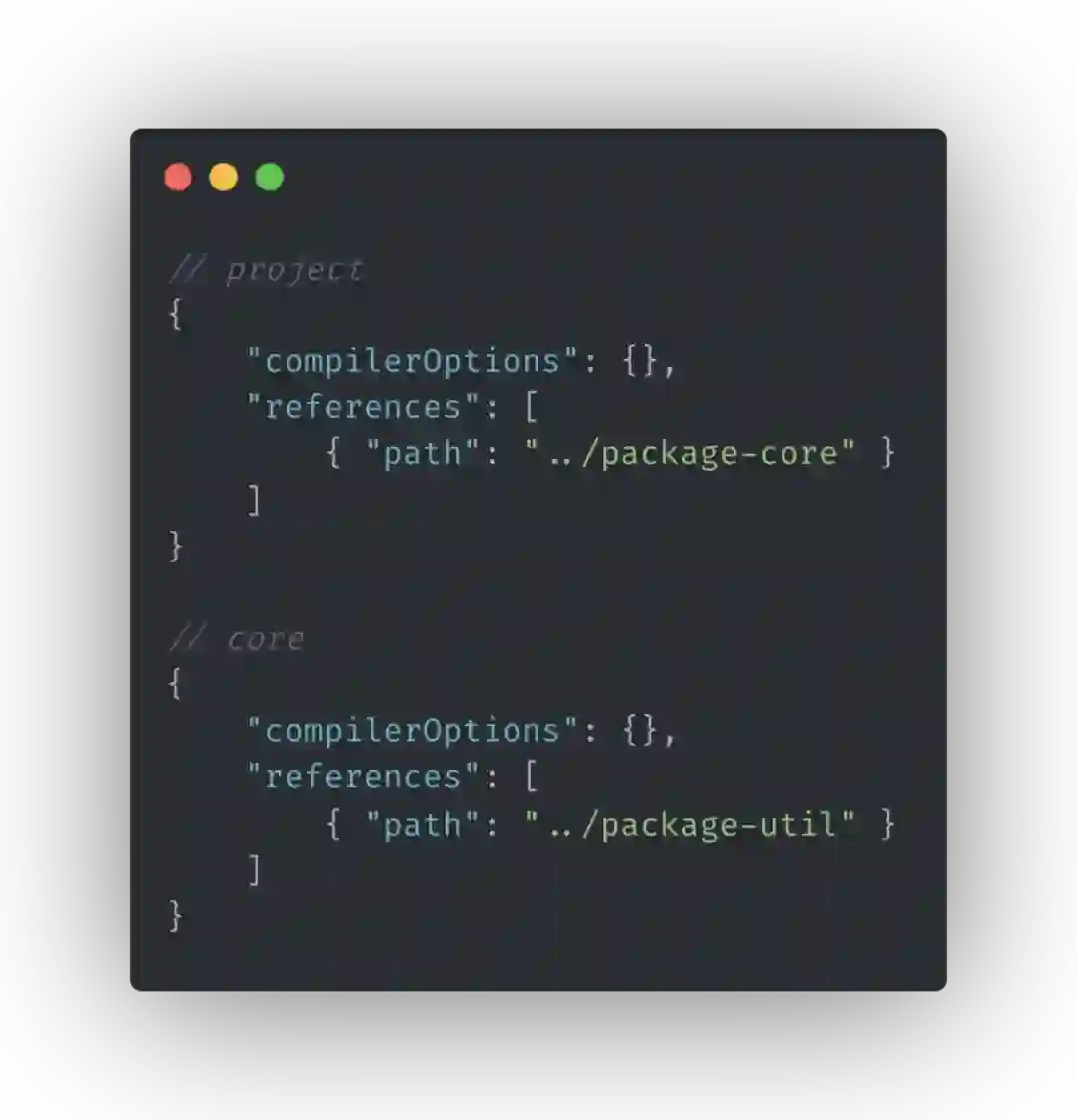 所以 Project References 就出现了,它的主要作用是使得你可以把整个 TypeScript 项目拆分成更细的粒度, 我们在上面这张图中声明了一个引用链,project 引用 core,core 引用 util,通过使用与 Project References 一起引入的新的 tsc 选项 --build,我们在 project 目录下执行 tsc--build,它会自动的最先去编译 util,然后才是 core 与 project。同时每一个部分都能确保使用自己的 tsconfig 进行编译,前端项目的话 ts-loader 同样支持了这一功能的。同时,它能精确地做到在依赖的项目更新时自动地去按需编译。