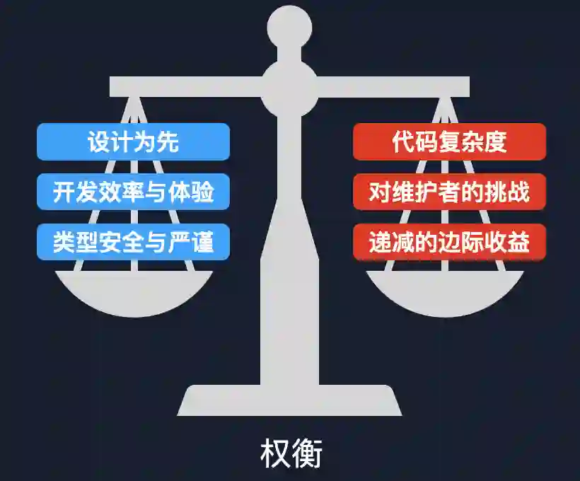 大家都能说出把类型写好了的优势:类型安全、稳定性、开发体验,这也是为什么它现在能成为新项目的首选。而且,最重要的一点,良好的类型编程范式要求你的类型体系是预先设计过的,而不是拍脑袋这里一个接口那里一个类型别名,后面再为了可维护性去收拢它们。