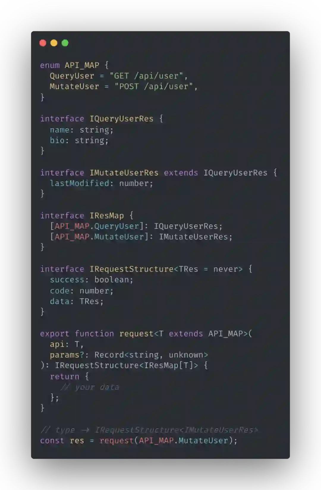 但这些断言实际上都是不必要的,最简单的方式是只要给请求方法预留一个泛型坑位,直接作为返回结果也行,当然这就没什么意义了。在工程实践中我们通常使用统一的请求方法,所以如果每个调用请求的地方都能被自动推导出响应的类型,我们就能够在减少许多类型代码量的同时保证更精确的类型。