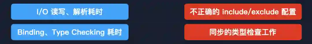 而关于定位性能问题就比较简单了,最常见的导致耗时异常的就是不正确的 include 以及 exclude 配置,即包含了不该有的文件,没有把无关文件剔除掉,你可以用 tsc --listFiles 来检查所有被引入的文件。对于其他环节的编辑器耗时,你可以用 --extendDiagnostics 来获得完整的各个阶段的耗时,比如 I/O、解析、类型检查等等环节。
