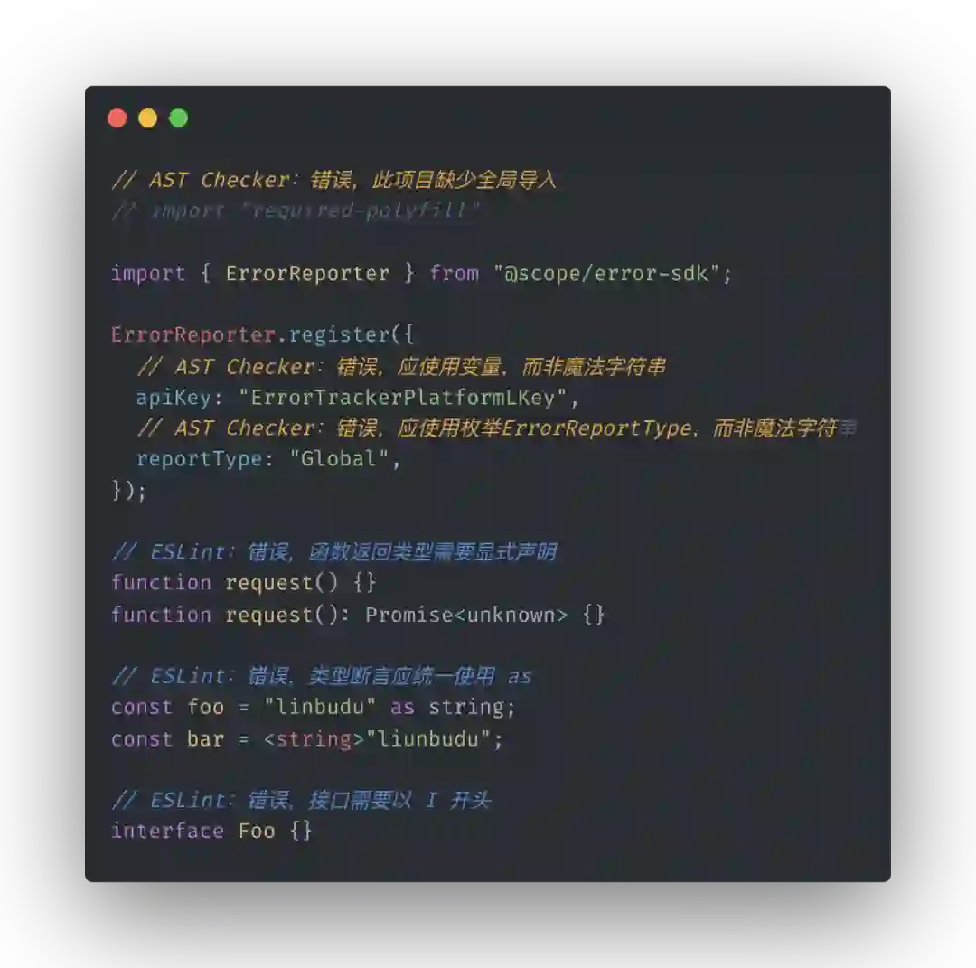 但实际上还存在着一些场景是 Lint 做不到也不应该由 Lint 来做的,比如我们前面说过的,要求页面的入口文件必须有某个模块导入作为 polyfill,或者要求某个函数的调用必须通过枚举的形式调用,魔法字符串和变量都不行,我把这一部分称为源码级约束,也就是 AST Checker。
