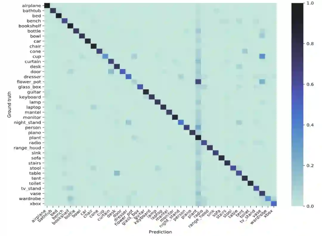 作者阐述了这些失真是点云应用中非常常见的,并且保证了生成的数据集仍然保持了原有的语义,如图2所示。图3展示了在ModelNet40-C上6个模型的平均混淆矩阵,对角线上的比重依然很高,这同样交叉验证了ModelNet40-C的语义不变性。