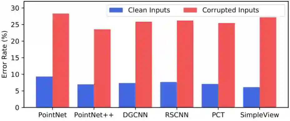 图1. 深度点云识别代表性模型在ModelNet40和ModelNet40-C数据集上的错误率。