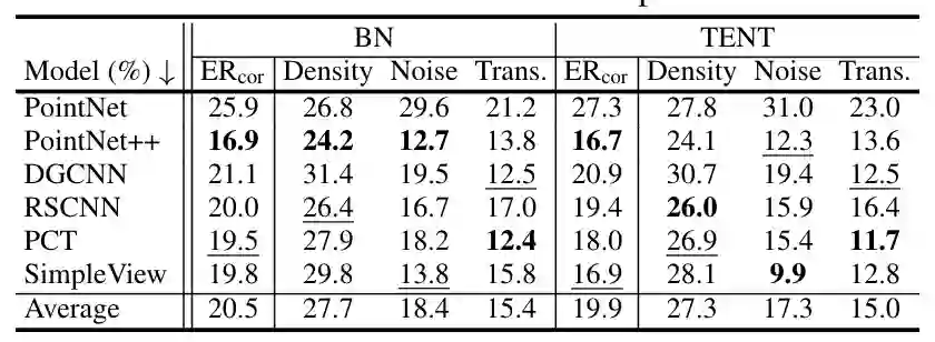 在构建ModelNet40-C之后,作者进行了大批量的基准测试,包含不同模型架构设计,不同数据增强方法,以及不同自适应方法的实验设置。