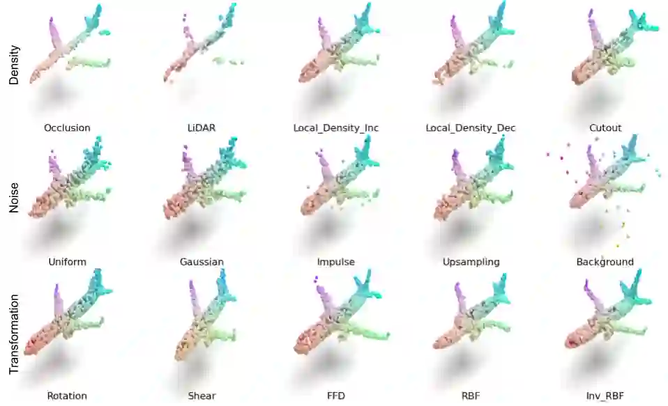 ModelNet40-C的失真分为密度 (density) 失真,噪音 (noise) 失真,以及变换 (transformation) 失真三类。