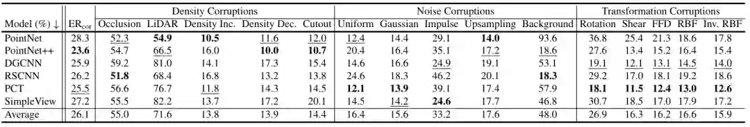 如表1所示,作者在PointNet, PointNet++, DGCNN, RSCNN, PCT, 以及SimpleView 六个模型上进行了基准测试。作者总结了一些发现: