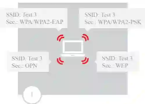 图 4 中的场景使用相同的 SSID 创建了多个接入点,对于那些可以探测到但是无法接入的 WiFi 网络,这个技术可以发现网络的加密类型。通过启动具有所有安全设置的多个接入点,客户端会自动连接和本地缓存的接入点信息相匹配的接入点。