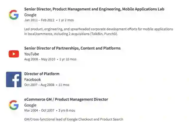 在 Facebook、YouTube、谷歌担任高管之余,他还是包括 Pinterest 等多家公司的顾问或董事会成员,也担任过社交初创企业 Badoo 的 COO。