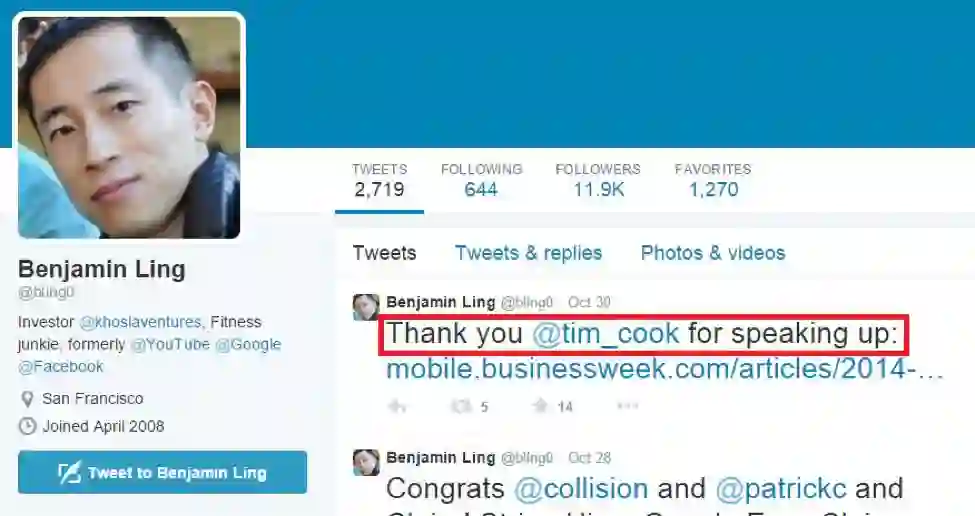 在库克出柜后,Ben 曾立即在推特上公开支持库克出柜。可笑的是,这成为了媒体指证他为库克男友的唯一证据……难道不允许人家 LGBTQ 圈子支持一下同道中人吗?!
