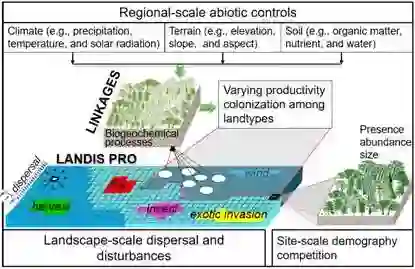 图1. 结合区域、景观和林分尺度过程的树种分布耦合模拟方法