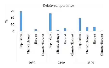 图3. 种群动态、采伐、气候变化及其交互作用对树种(以white oak 为例)分布变化的相对贡献