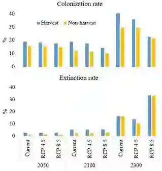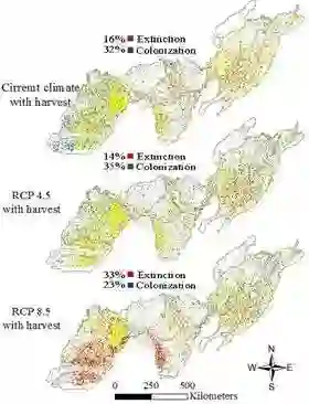 研究发现大部分的北方、广分布及少数南方树种的分布面积将缩减,大部分的南方树种的分布面积将扩张;种群动态是影响树种分布变化最重要的过程;在短期和中期,采伐的作用比气候变化的作用大,但在长期,气候变化的作用比采伐的作用大,采伐和气候变化有交互作用,采伐将加速由气候变化导致的分布面积缩减(特别是北方树种)和分布面积扩张(特别是南方树种);树种生物属性如繁殖能力、成熟时间、扩散能力对未来树种分布变化起重要作用。该研究强调了在气候变化下,种群动态和采伐对提高未来树种分布预测起到很重要的作用,在理论上把影响树种分布的多尺度过程纳入对气候变化响应的预测,完善了树种分布预测的模型理论,提高了预测的真实性;在应用上为资源管理和物种保护提供理论基础,也为制定适应气候变化的策略提供科学支撑。