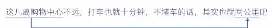 自然语言形成的文本中,常常有长距离的逻辑关联。这种逻辑关联既包含来自语言结构的依存关系,也包含语义层面上的逻辑关系,而且二者互相渗透。以下面的句子为例,它包含了一个语义信息「这里距离购物中心两公里」,但是要做出这个判断,需要跨越句头和句尾中间的距离,依靠语义上的连续性来发现前后的逻辑关联。这种逻辑关联,往往很难靠类似循环神经网络(RNN)这样的简单序列处理模型来发现和利用。