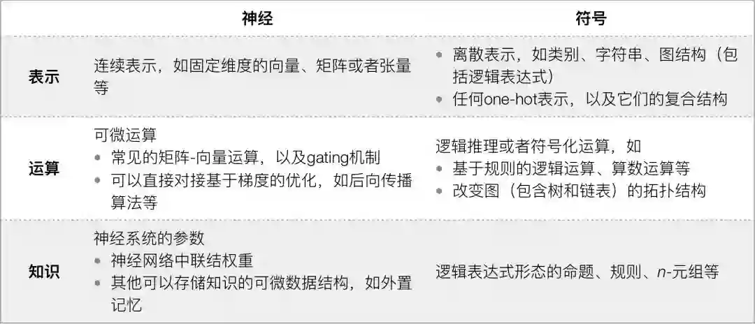 我们用下表来总结神经网络和符号智能在表示、运算和知识三个层面上的区别。