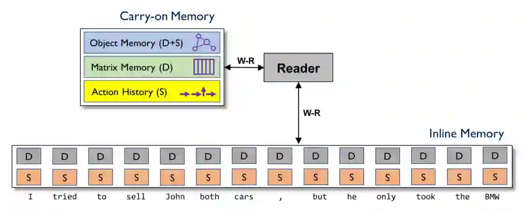 如图 9 所示,OONP 由三部分组成,分别是主控模块阅读器(Reader)、表征文档的行间记忆(Inline Memory)模块、以及总结对之前文本的理解的携带记忆(Carry-on Memory)模块。而携带记忆(Carry-on Memory)模块又可分为表征图结构的对象记忆(Object Memory)、存储连续状态的矩阵记忆 (Matrix Memory) 和记录离散动作的动作历史 (Action History) 三部分。