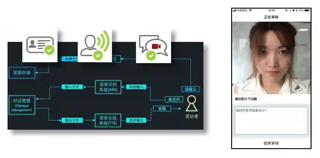 智能视频审核:该场景是对借款人进行视频面试,从而基于交互过程进行信息审核和欺诈检测(见图 13)。深度好奇的智能视频审核系统依靠对语音对话的理解来构建对话系统,在沟通过程中根据用户信息判定高欺诈风险的信息点,并进行主动的问询。例如,当借款人提供的职业信息是「养生会所的工作人员」时,该系统就会追问「你们公司的客流量有多大」、「你们公司的主要设备是什么」这类的问题。完整的对话过程将会被用来评估及判定借款人骗贷和逃贷等风险。