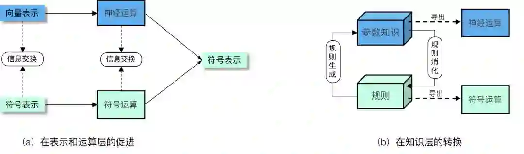 神经符号系统可以在表示、运算、知识三个层面上,形成神经和符号间的并列和对应。这里,并列是指同时存在功能重合的神经和符号两种状态,这形成了某种程度的冗余,可以被系统择优使用或者同时使用(见原则-III);而对应则意味着神经和符号两种状态之间存在设计的信息交互,这种交互可以帮助一种形态转换成另一种形态,也可以同时促进两种形态的共同训练(co-training)。(注:这里的 co-training 是从 multi-view learning 的角度来鼓励两个或更多通路的一致性,而非强调在其半监督学习场景下的应用。)这三个层面上的并列和对应可以有多种方式,下面仅举两例。我们在 2017 年提出的神经-符号双通路的问题解析模型 [11](见图 3-a):对一个问题(如「北京奥运会是哪一年举行的?」),系统会有包含解析和运算的神经通路,也会有一个近乎对称的符号通路。两条通路殊途同归,同时会有密集的信息交换。神经通路可以高效地利用后向传播算法学习,而符号通路则通过符号化的总结而具有高执行效率和很好的泛化性能。通过在训练中鼓励两条通路的一致性,我们可以获得比单一通路更好的学习效率、执行效率以及泛化性能。我们最新的一项技术(见下文中的 Nerual Rule Engine),则可以部分地完成知识层上的转换(见图 3-b),从而利用神经网络天然的泛化能力克服规则系统的脆弱性。图 3-b 也描述了上述转换的逆过程,即神经网络中的参数知识被总结成为规则,这个过程通常被称为规则抽取(rule extraction)。